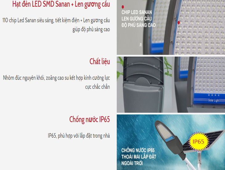 - Đèn sở hữu cấu tạo khép kín nên thích nghi tốt với môi trường ngoài trời. Đèn được thiết kế với tiêu chuẩn IP65 ngăn chặn sự xâm nhập của nước từ mọi hướng, chống 100% bụi bẩn, tạp chất lơ lửng. Lớp sơn tĩnh điện giúp ngăn chặn hiện tượng bạc màu, oxy hóa yên tâm khi sử dụng mang lại lợi ích cho con người lên ngày nay đèn năng lượng mặt trời được sử dụng rất nhiều trong công trình, đời sống